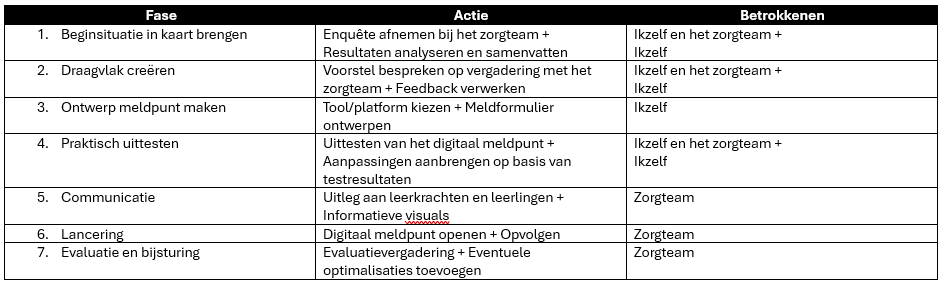 Het proces wordt geëvalueerd op basis van de implementatiefase, communicatiecampagne en gebruiksvriendelijkheid. Een mogelijke evaluatiemethode is het organiseren van tussentijdse feedbackmomenten met het zorgteam, waarbij besproken wordt of de meldingen overzichtelijk binnenkomen, de werkdruk beheersbaar blijft en de werkwijze uniform is. Daarnaast kunnen leerlingen bevraagd worden via een korte digitale enquête waarin gevraagd wordt naar hun gebruikservaring, het gevoel van toegankelijkheid en de mate waarin ze het meldpunt effectief vinden. - Evaluatie